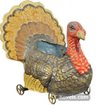 Thanksgiving collectibles aren’t as popular as Christmas or Halloween items, but determined collectors can find many ceramic, glass, pottery, paper and wood turkeys. This composition turkey on wheels was part of a child's skittles set. It sold for $2,124.