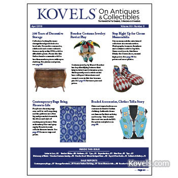 Kovels On Antiques & Collectibles April newsletter features contemporary rugs, vintage circus memorabilia, Boucher costume jewelry, storage furniture and beaded Indian clothing, all with information, photos and prices.
