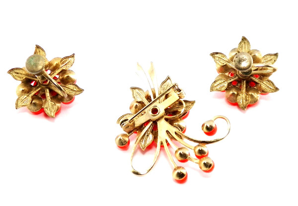 Bright Orange “Moon Glow” Lucite beads are the focal point in this demi-parure. Considered to be “cutting edge” and innovative when introduced during the 1940′s and 1950′s, Collectable plastic jewelry is divided into three basic categories: Celluloid, Bakelite and Lucite. Jewelry created using plastics from that period are not only beautiful, they are durable, quality pieces and are highly collectable to those “in the know”. This earring/brooch set is a fine example of “plastics” done right……