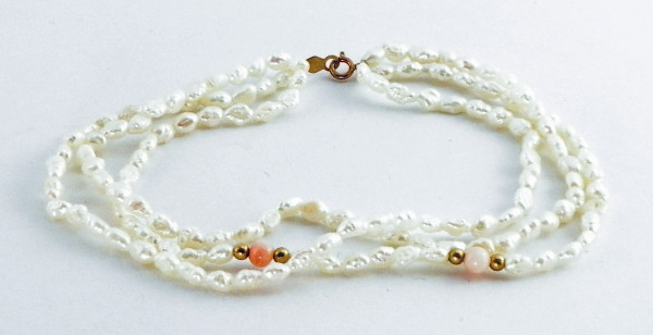 Seed Pearl Bracelet with coral beads 14k Gold clasp 7 in. length