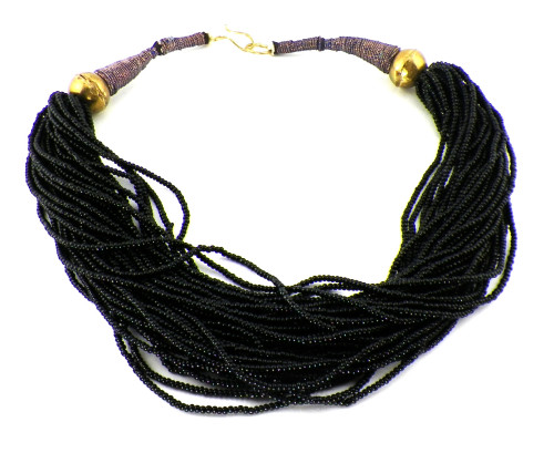 Multiple Strands Black Glass Seed Pearls anchored at each end by Brass Beads and Cord Wrapping.