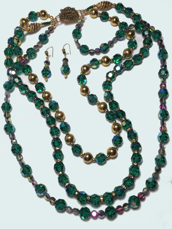 3 Strands of Vintage Crystal beads with matching pierced earrings. Not for the faint of heart.